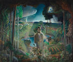 N. C. Wyeth was a great admirer of philosopher and naturalist Henry David Thoreau (1817-1862), and found artistic inspiration in Thoreau’s writing. The many visits Wyeth made to Walden Pond inspired him to create this fanciful view of Thoreau’s world. Its imagery is drawn from Thoreau’s books, principally Walden, or Life in the Woods (1854), in which Thoreau chronicled more than two years of his life spent living in a rustic cabin on the shores of the pond. Thoreau’s bean field, his boat, a fox, a pair of bluebirds, the nearby railroad, and the village of Concord, Massachusetts, are all referenced in Wyeth’s painting. The meticulously rendered botanical specimens in the foreground speak to Thoreau’s reputation as a naturalist.