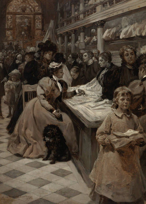 The Woman in Business is one of a series of six full-page illustrations Stephens painted, collectively titled "The American Woman," commissioned by Ladies’ Home Journal. In the series, Stephens highlighted the changing roles of women in American society. This illustration depicts a late nineteenth-century shopping scene at Wanamaker’s department store in Philadelphia, including women of different social classes and emphasizes the prominent role of women in the workplace. The young girl in the foreground underscores the era’s child labor practices.